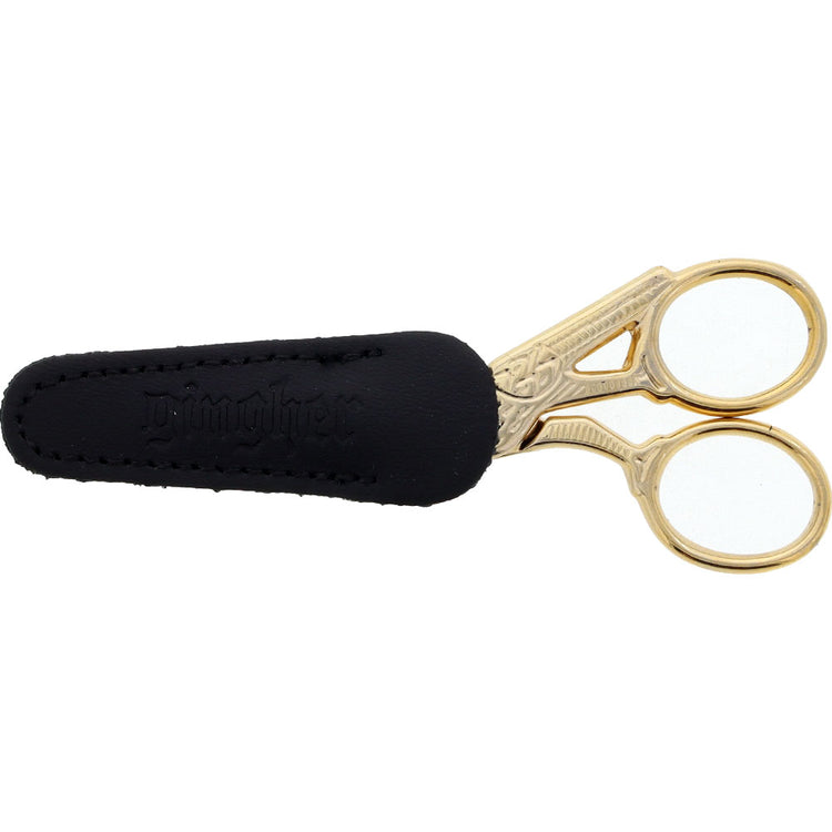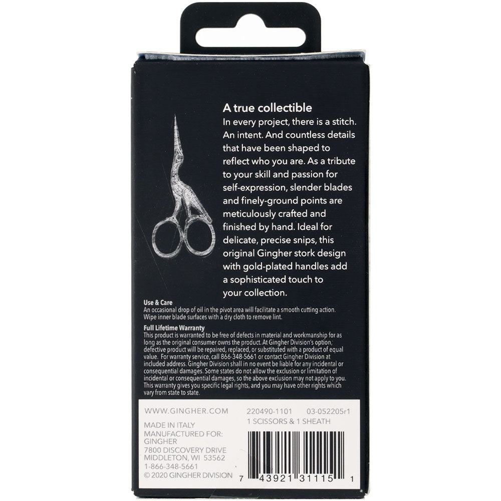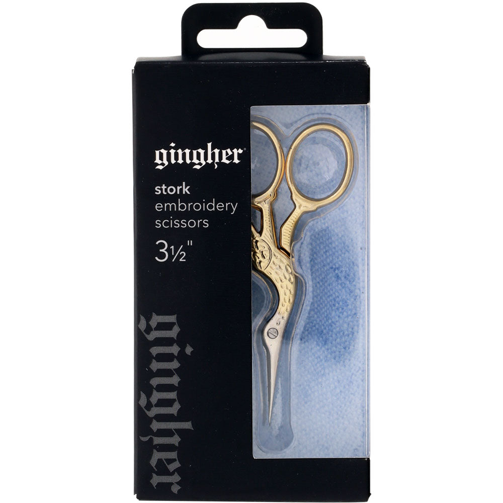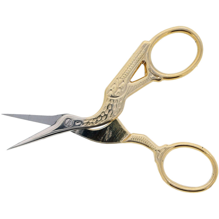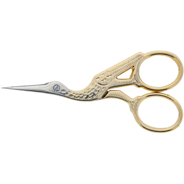 Beautiful design and precise function are combined in Gingher's 3-1/2" Stork Embroidery Scissors. Enhanced with gold-plated handles, these scissors are perfect for cutting threads (not heavier yarns or fabric). Each pair includes a fitted leather sheath for storage and travel. The durable blades are nickel plated to ensure they will last for years to come.