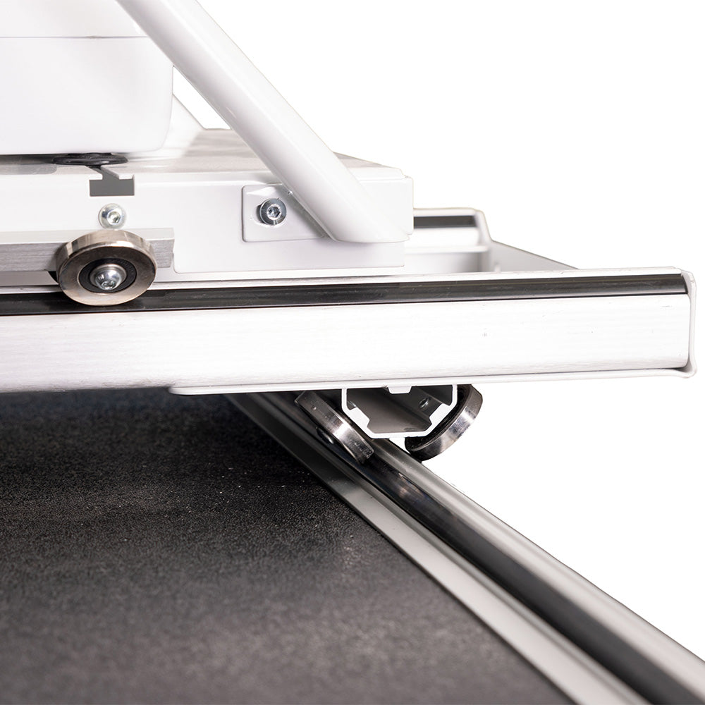 Smooth and fluid gliding track system allows your machine to roll back and forth on a track. This enhances stitch quality, efficiency, accuracy, and carriage motion.