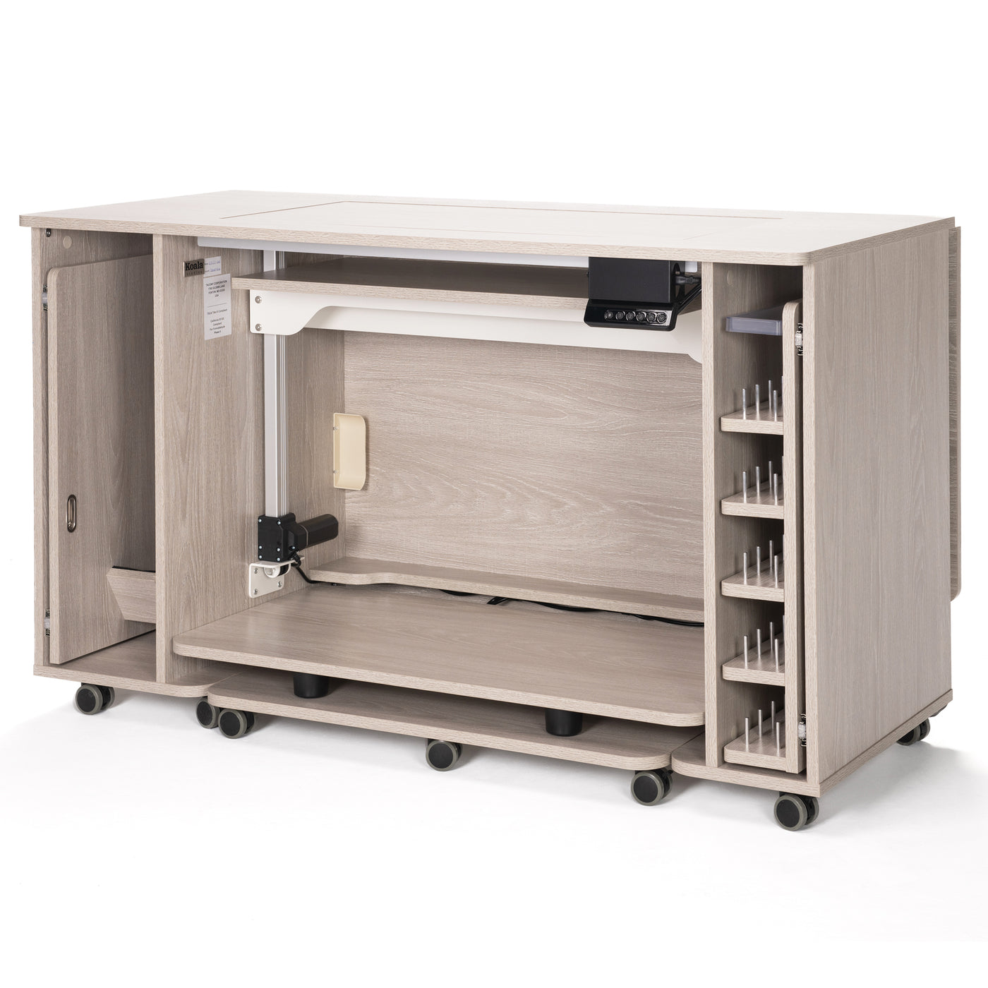The glide-out Embroidery Module/Hoop Storage and integrated Thread Closet place essentials right where you need them, reducing clutter and keeping hoops, threads, and accessories within easy reach. A built-in electric sewing machine lift allows you to adjust your machine to the ideal height for sewing or embroidery, promoting better posture and all-day comfort while you work. Best of all, the Koala All-In-One Embroidery Studio arrives fully assembled, so you can skip the setup and get straight to creating. Designed with Koala’s signature durability and attention to detail, this studio is a reliable, space-conscious centerpiece for your sewing room.