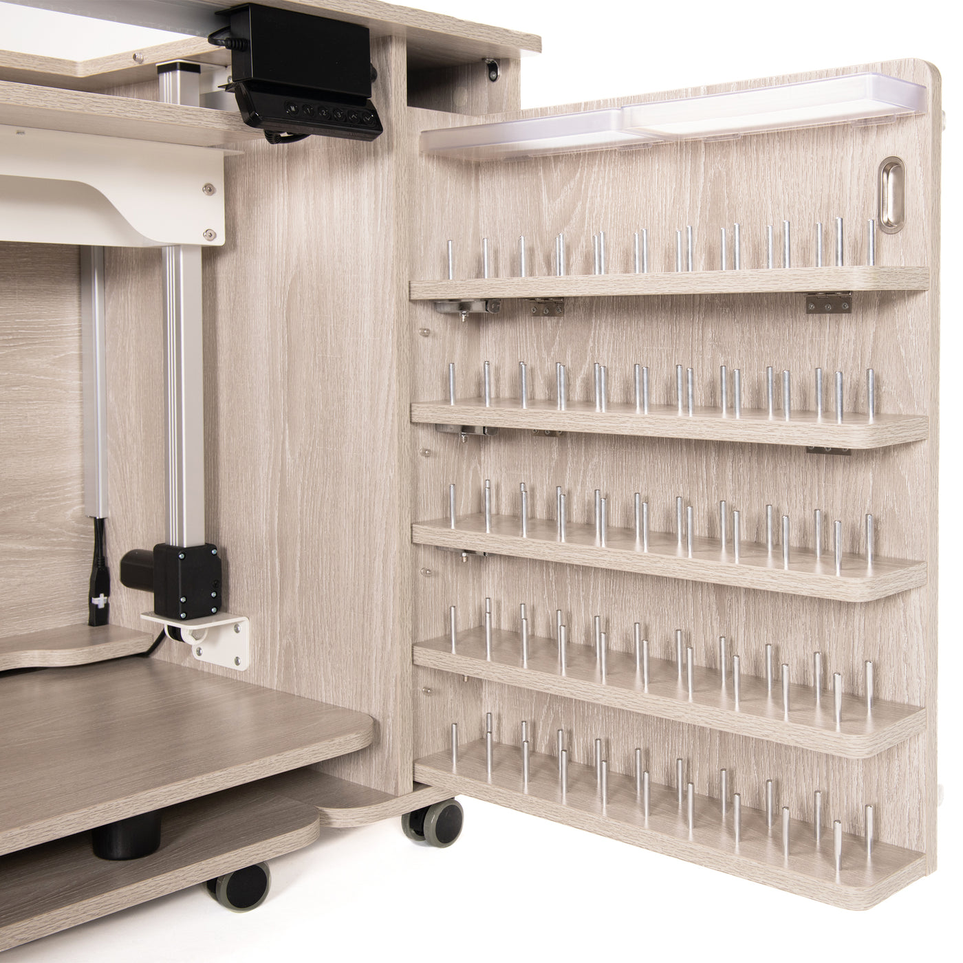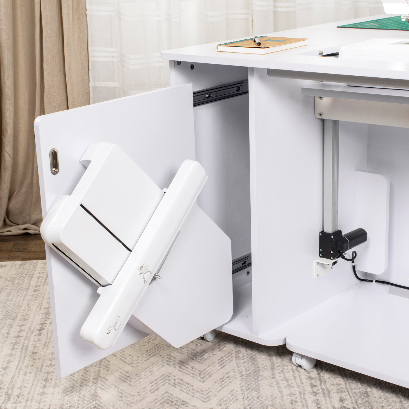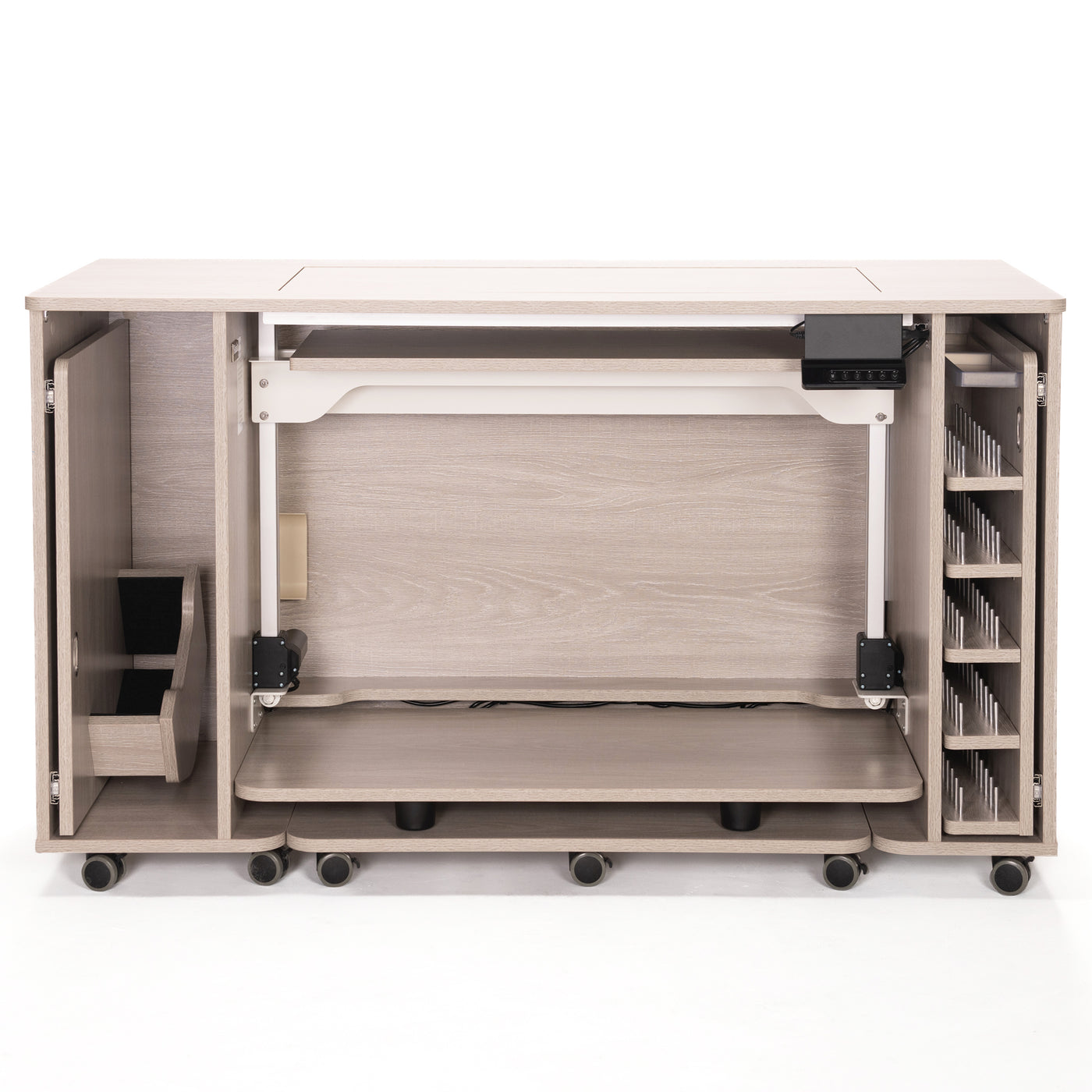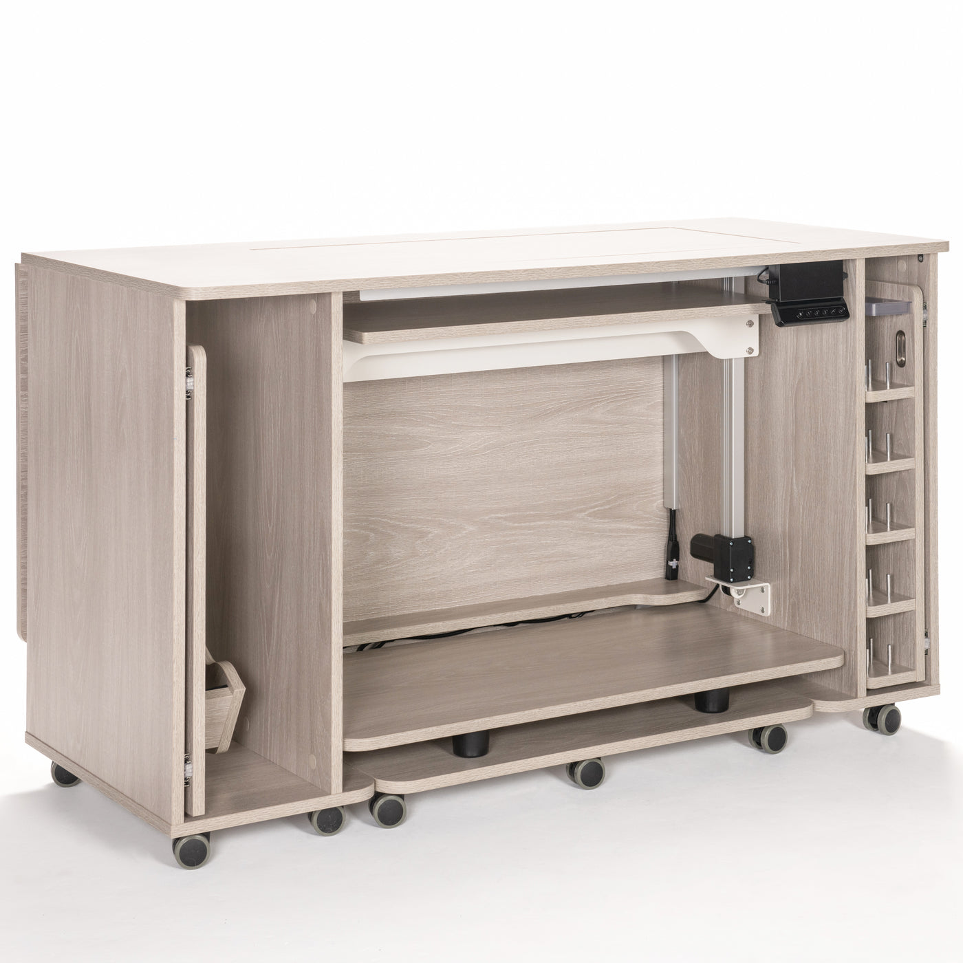 Built for stability and everyday reliability, the electric glide lift supports your machine securely while operating quietly and smoothly. By promoting proper posture and reducing fatigue, it turns your sewing cabinet into a truly ergonomic workspace—so you can focus on precision, creativity, and enjoying every stitch.