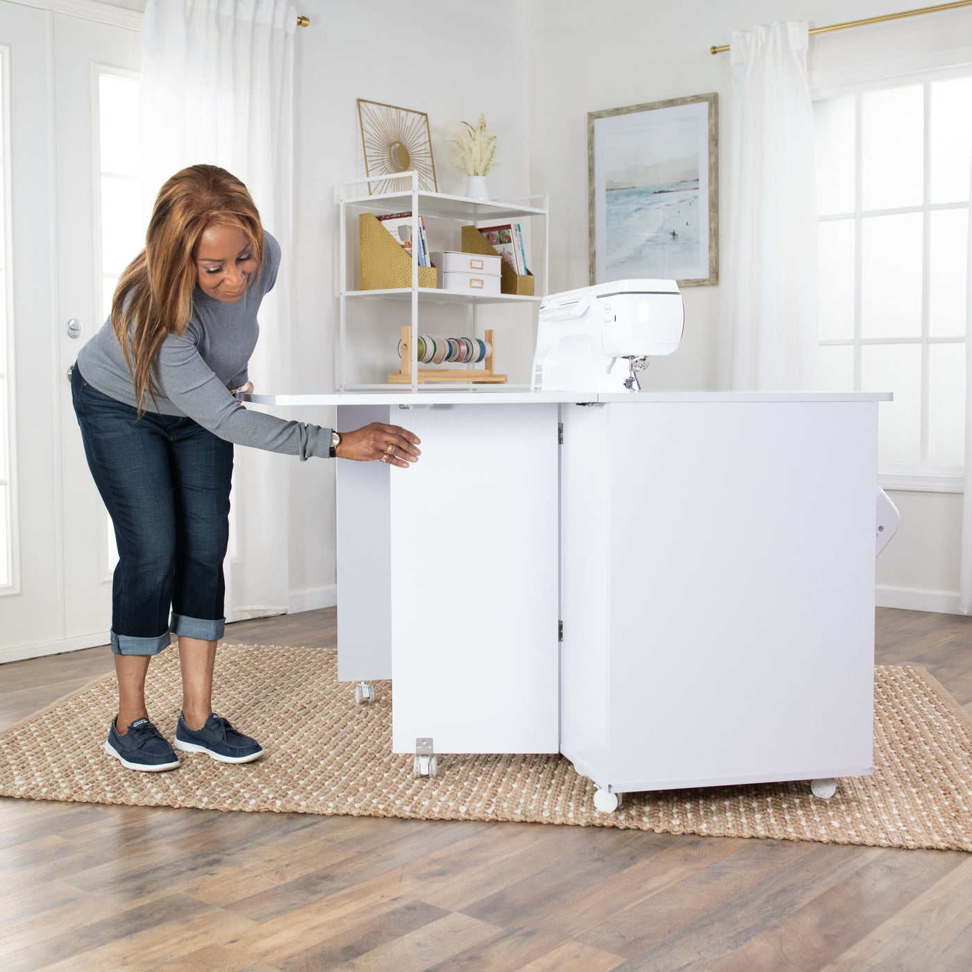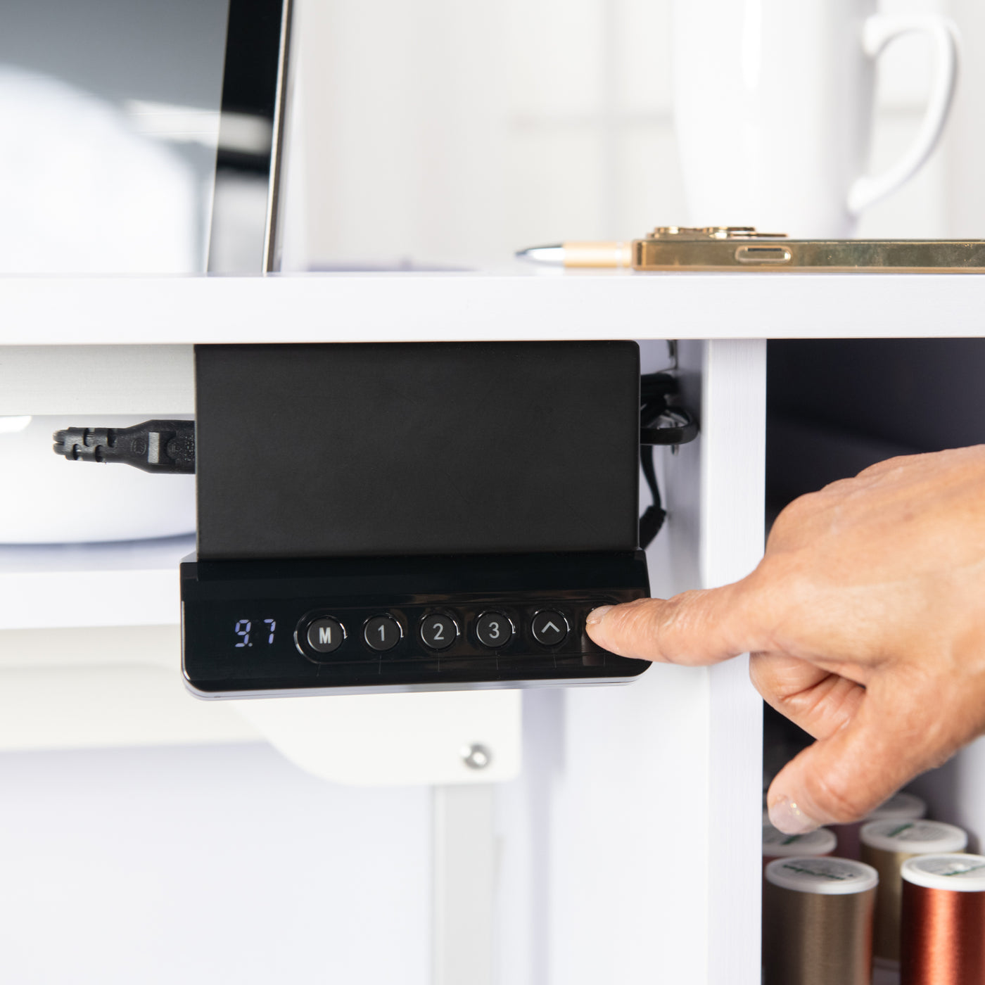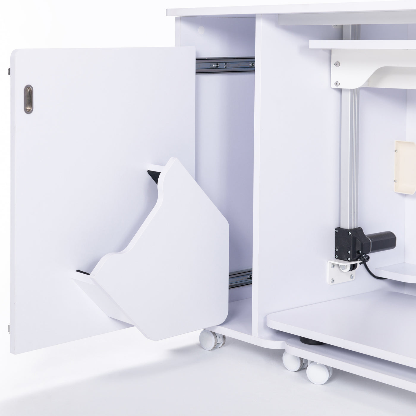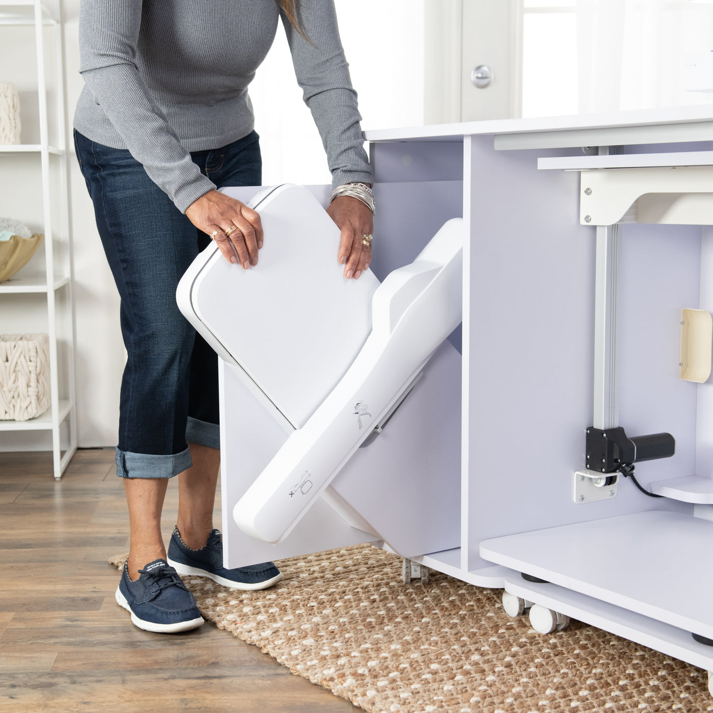 Built for stability and everyday reliability, the electric glide lift supports your machine securely while operating quietly and smoothly. By promoting proper posture and reducing fatigue, it turns your sewing cabinet into a truly ergonomic workspace—so you can focus on precision, creativity, and enjoying every stitch.