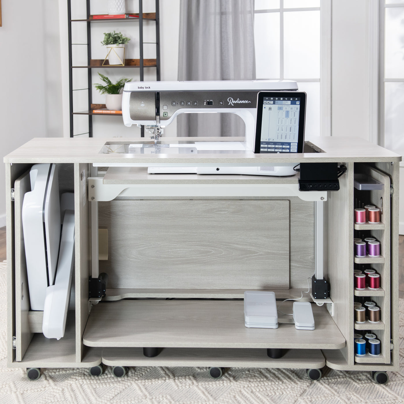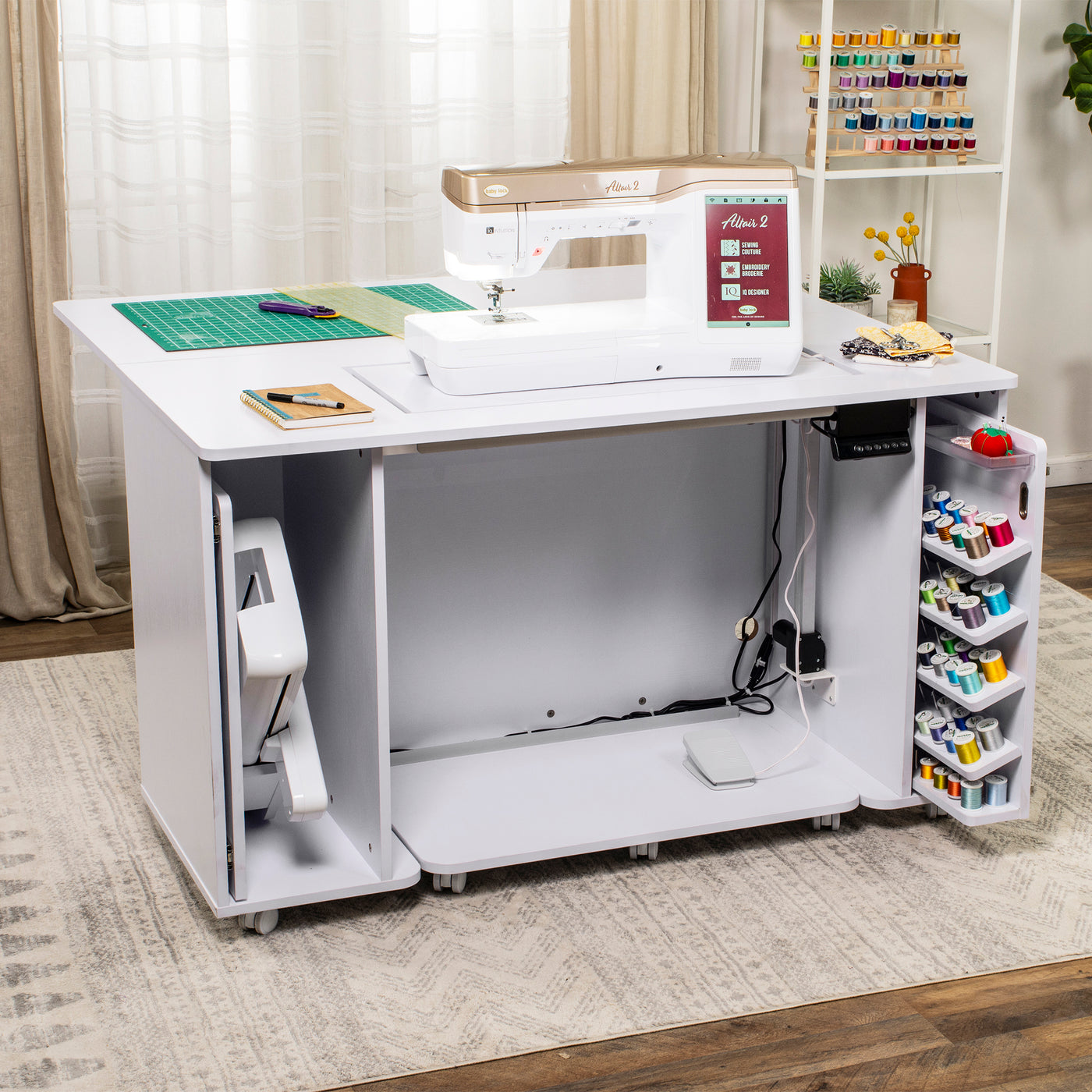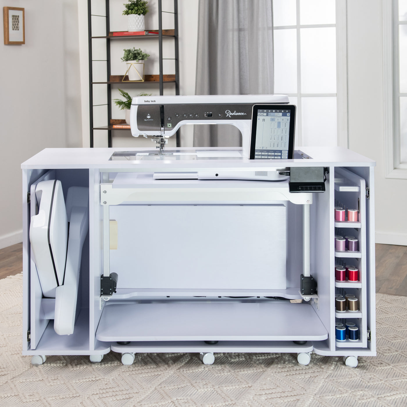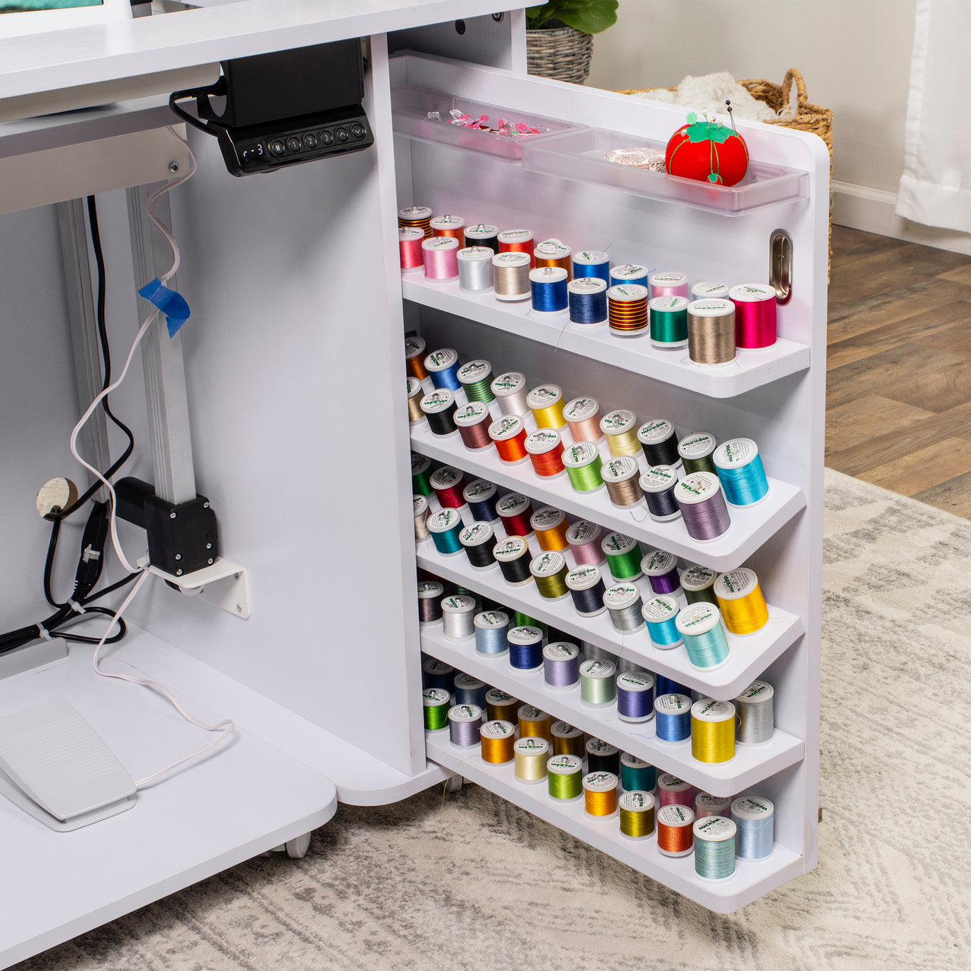 Built right into the cabinet, this dedicated thread closet helps reduce clutter on your work surface while keeping essential supplies within arm’s reach. Whether you’re switching colors during embroidery or grabbing a matching spool for a sewing project, having organized, accessible thread storage right where you work makes every session smoother, more efficient, and more enjoyable.