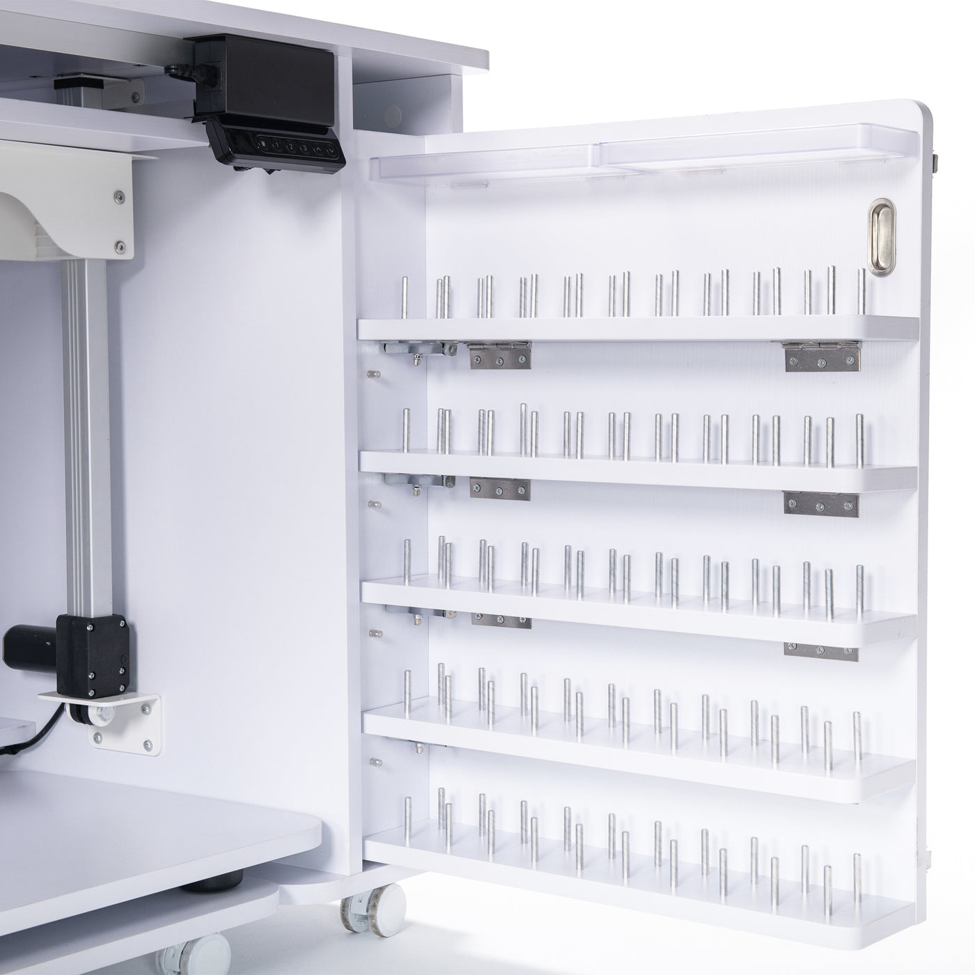 The 100 Spool Thread Storage Closet on the Koala All-In-One Embroidery Studio offers generous, thoughtfully arranged storage for your thread collection. Spools are stored upright and clearly visible, so finding the perfect color is quick and frustration-free—no digging through drawers or boxes mid-project.
